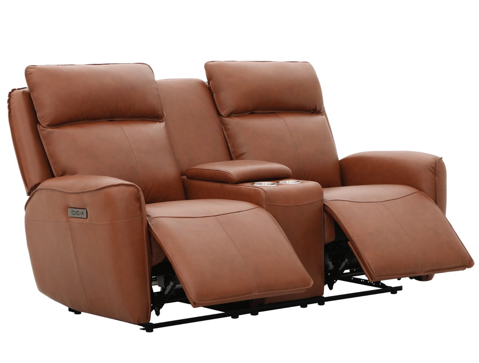Tässä kalustossa on lisäksi kahdenistuttava kotiteatterisohva, jonka istuinten välissä on mukitelineet sekä säilytyslaatikko.