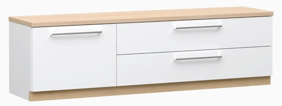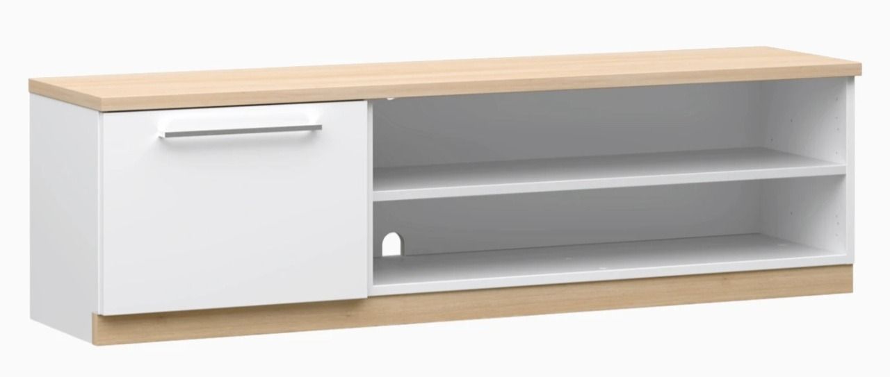 Tason korkeus on suunniteltu erityisesti televisiokäyttöön, jotta katselukulma on sohvalta katsottuna luonnollinen ja miellyttävä. Metallivetimet tuovat kokonaisuuteen ripauksen modernia ilmettä ja tuntuvat miellyttäviltä käytössä. Reunasta reunaan ulottuva, magneeteilla kiinnittyvä sokkelilista viimeistelee kalusteen linjakkaan ja viimeistellyn ilmeen.