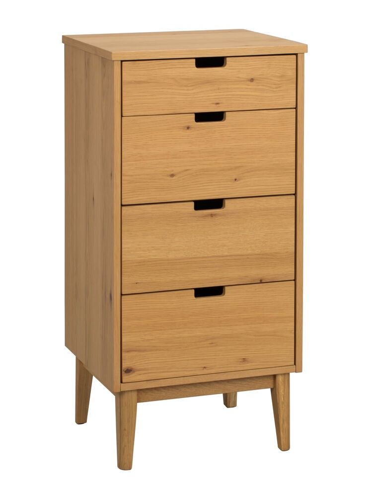 Neljässä laatikossa on leikattavat vetimet ja kevyesti kapenevat jalat, jotka antavat ilmavan ja hienostuneen ilmeen, pitäen lipaston silti käytännöllisenä ja tilavana.
